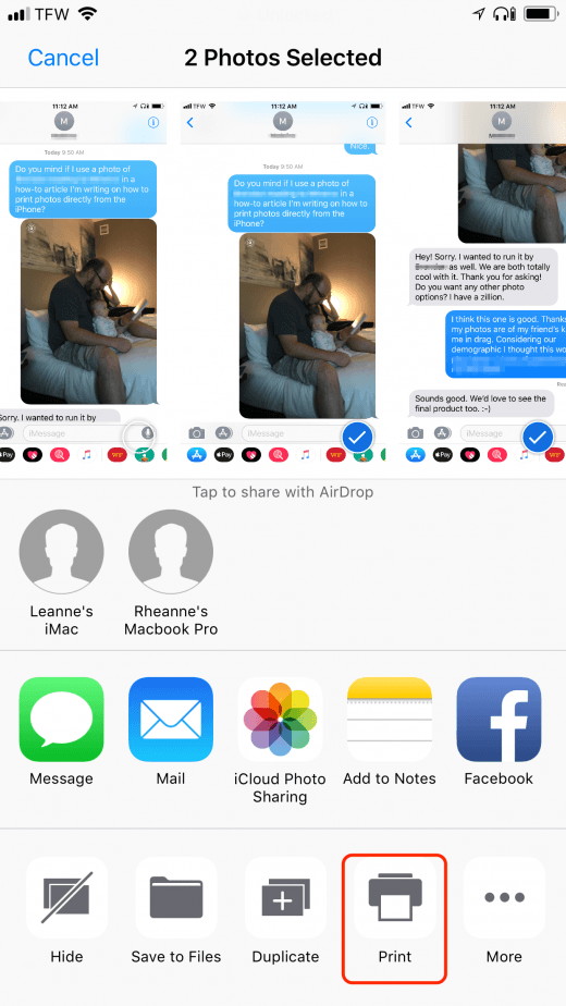 To make sure your images are in order, I recommend either numbering the screenshots via markup by editing each one before printing, or after printing going back through the text message on your iPhone and laying out your printed your pages to match the thread of the text. Then, you can number your pages with a pen so that your pages stay in order. Now you can staple, file, and share the document as needed. Where to Find & Add Photos in the Messages App on iPhone in iOS 12by Leanne Hays, iphonelife.com Adding a picture to a text message in Apple's Messages app used to be quick and easy; you just tapped the little camera icon to the left of the text field, chose an image, or multiple images, to attach, and sent your text as usual. With iOS 12, the familiar process for sending photos in Messages has changed: The camera icon is still there, but it only offers the option to take a new image to send and no access to your Photos app. Don't worry though, while access to your photo library has moved, it's still very simple to send images from the Photos app on your iPhone; let's learn the new way right now!
