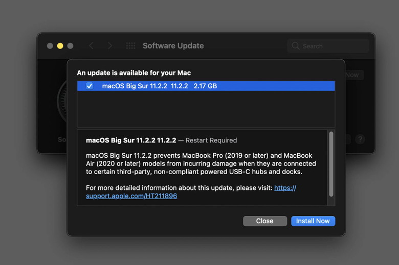 macOS Big Sur 11.2.2 prevents MacBook Pro (2019 or later) and MacBook Air (2020 or later) models from incurring damage when they are connected to certain third-party, non-compliant powered USB-C hubs and docks. That's all Apple says there is to this update. It's probably a good idea to grab it, but if you don't use powered USB-C devices the urgency is not as great.