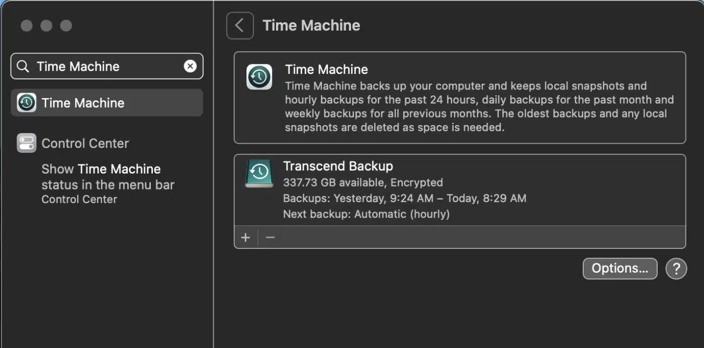 For example, this is what you see if you search for Time Machine in System Settings: