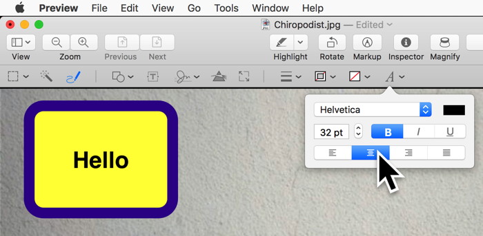 Text Style - Used to select the font and style of the text. Here is an example of text added to a rounded box. ReferencesThe official Apple website has a guide for Preview at this web page. LifeWire also have a good page at this web page.